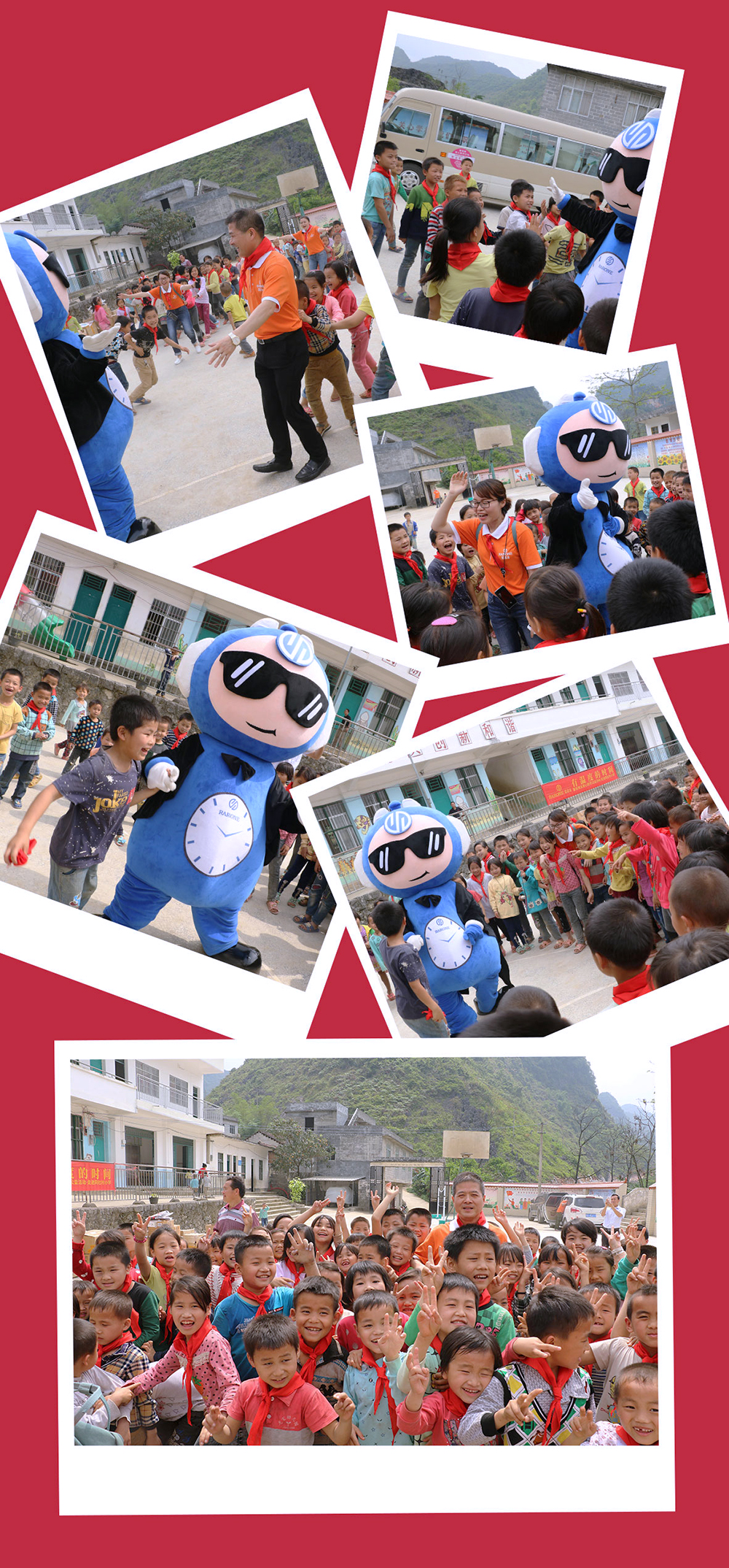雷諾表愛心小組在總經(jīng)理詹江洲先生的帶領(lǐng)下,從南寧市區(qū)出發(fā),一路上綠水青山風(fēng)景秀美,但在快要到達(dá)同社村的山路上,我們真正見識了九曲十八彎的大山路。經(jīng)過3個(gè)多小時(shí)的長途跋涉,我們的愛心車輛終于抵達(dá)同社村小學(xué),遠(yuǎn)遠(yuǎn)就看到學(xué)校的孩子在校門口等待我們,當(dāng)孩子們親手為我們系上鮮艷的紅領(lǐng)巾,雷諾表愛心小組的每個(gè)成員的使命感愈加強(qiáng)烈。