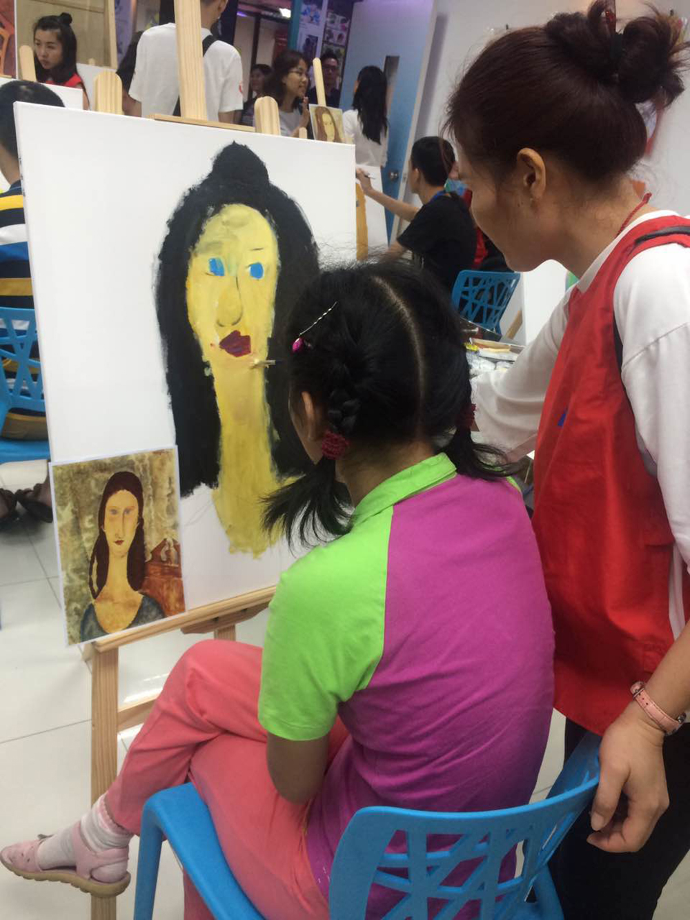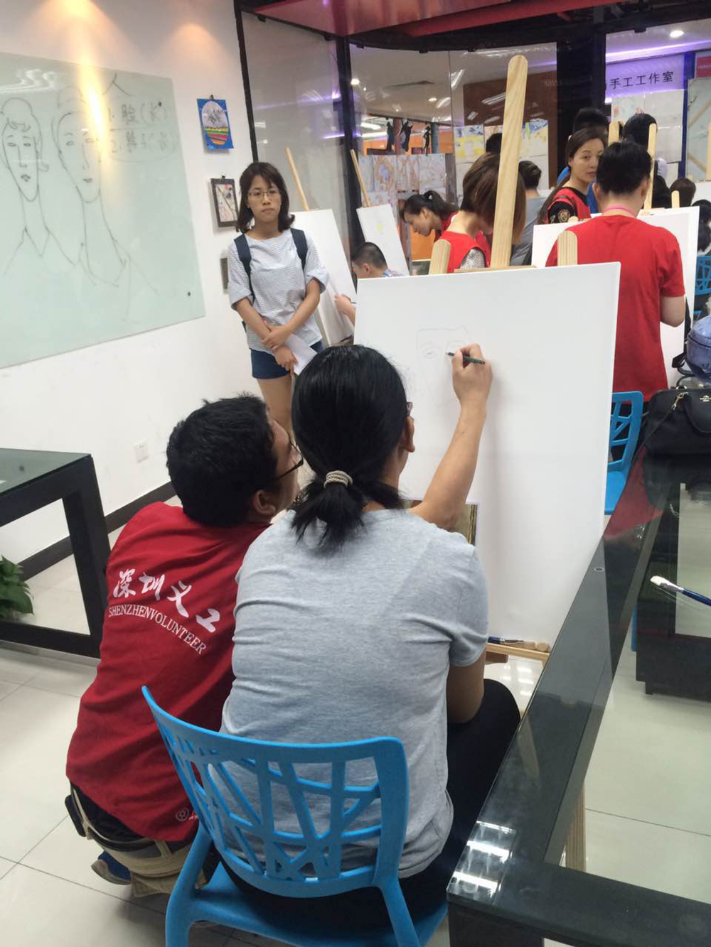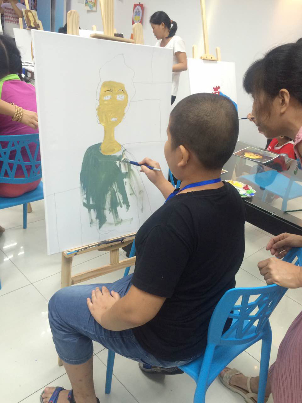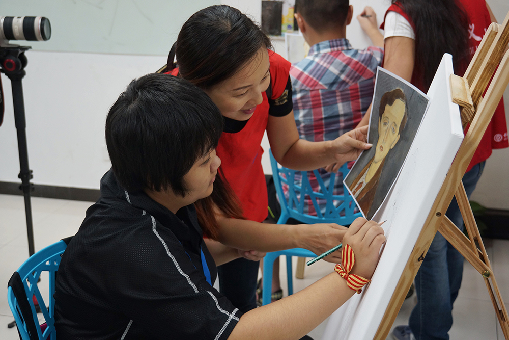 開課當(dāng)天,自閉癥兒童在義工的陪伴下,跟著繪畫老師學(xué)會畫筆,到慢慢完成繪畫課,他們的注意力很專注,對色彩有特別的偏愛,整個繪畫課程簡單有趣,加上義工的耐心陪伴,讓畫室洋溢著一種溫馨有愛的氣息。